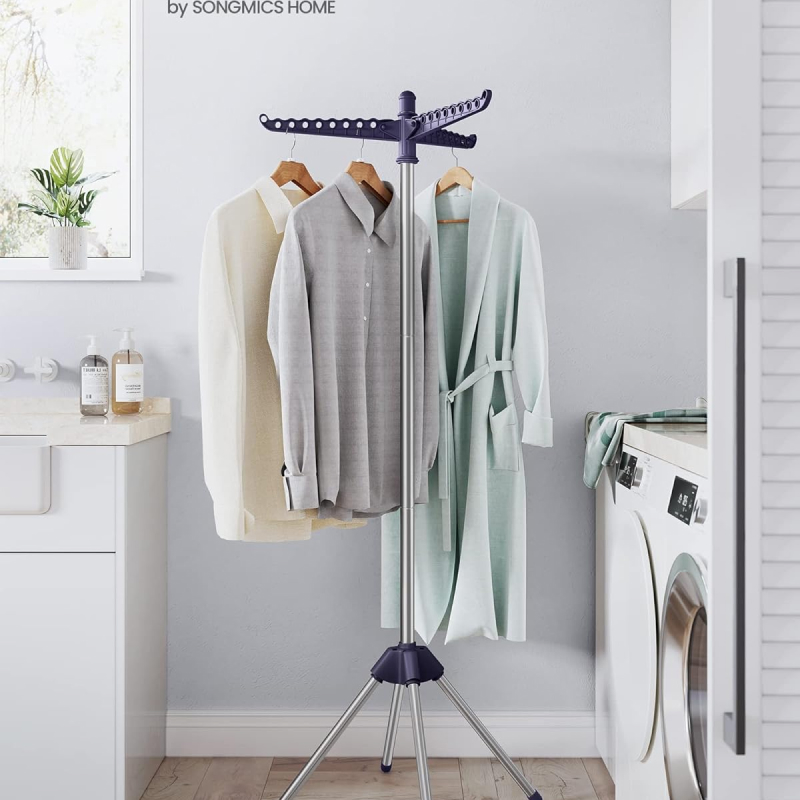 SONGMICS Clothes Drying Rack, 59-Inch High Folding Laundry Drying Rack with 3 Rotatable Arms for Hangers, 4 Legs, Stainless Steel, for 27 Pieces of Clothes, Blue and Silver ULLR510Q01